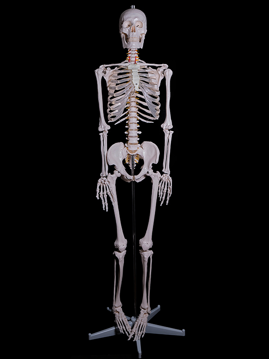 Модель разборная, с подвижной головой и конечностями. Высота модели - около 170 см. Изготовлена из пластмассы, окрашена и установлена на роликовой подставке. Позволяет демонстрировать человеческий скелет, его отделы и составляющие их кости.